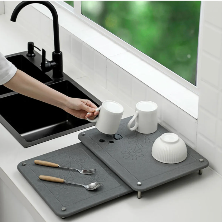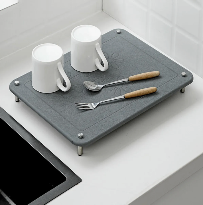 Uso Versátil: Este tapete secador de pratos em pedra serve para diversas finalidades. Use-o na bancada da cozinha para segurar com segurança pratos, copos, talheres, etc. Também funciona como um tapete à prova de calor, tapete de banho e até mesmo como um tapete para alimentação de animais de estimação, tornando-o um presente ideal.